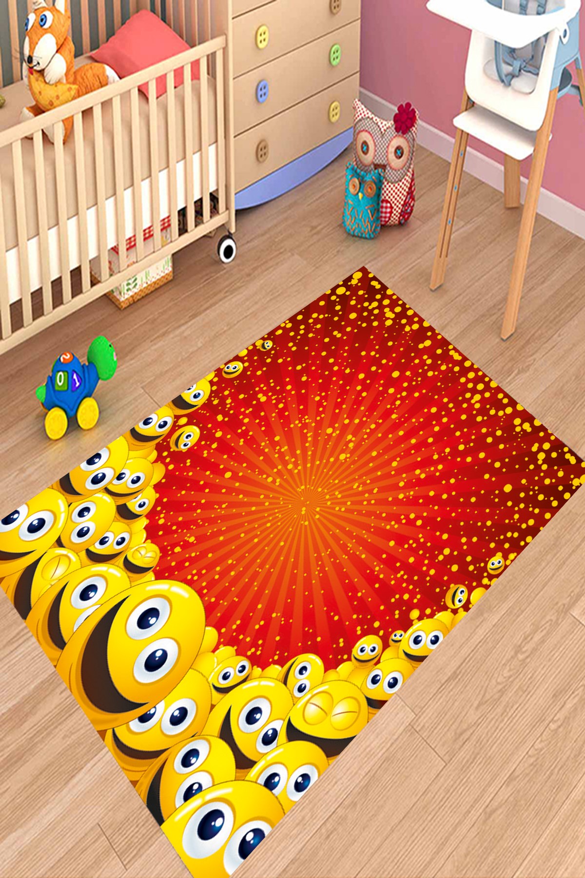 Dijital Baskılı Yıkanabilir Kaymaz Taban Kırmızı Renkli Gülen Yüzler Desenli Çocuk Odası Halısı