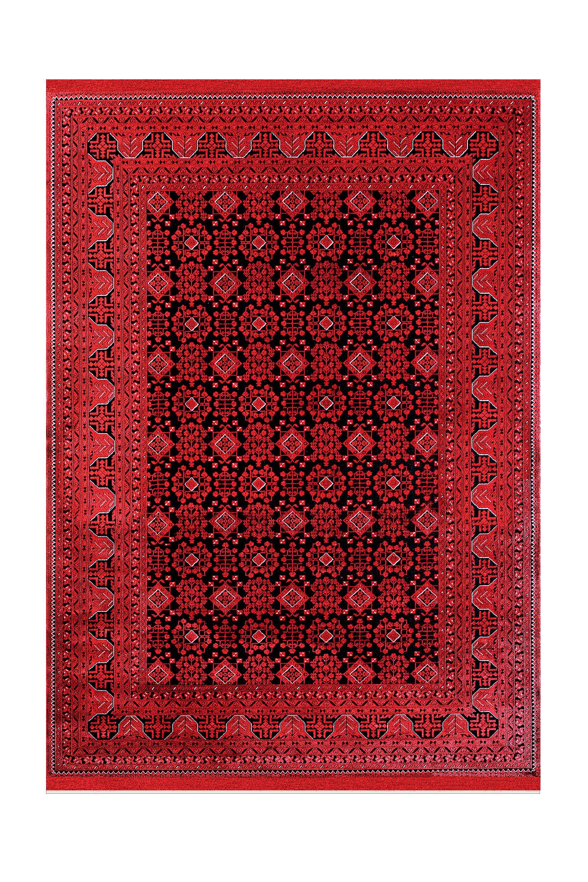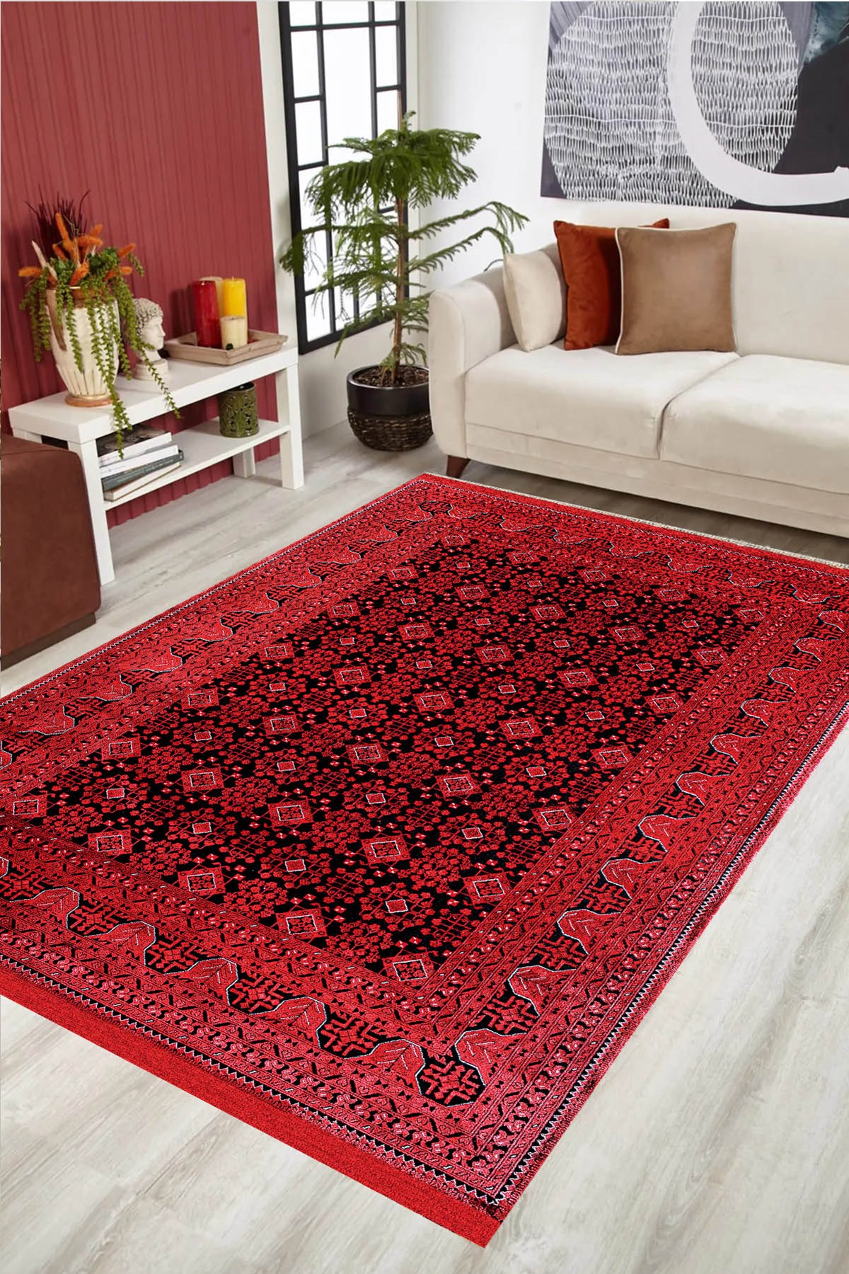 Dijital Baskılı Yıkanabilir Kırmızı Renkli Siyah Desenli Kaymaz Taban Halı