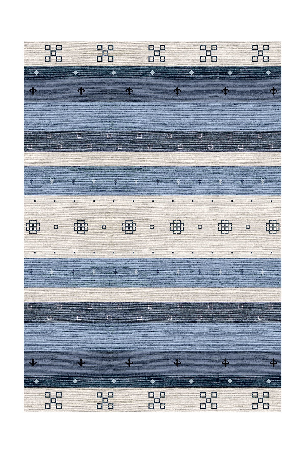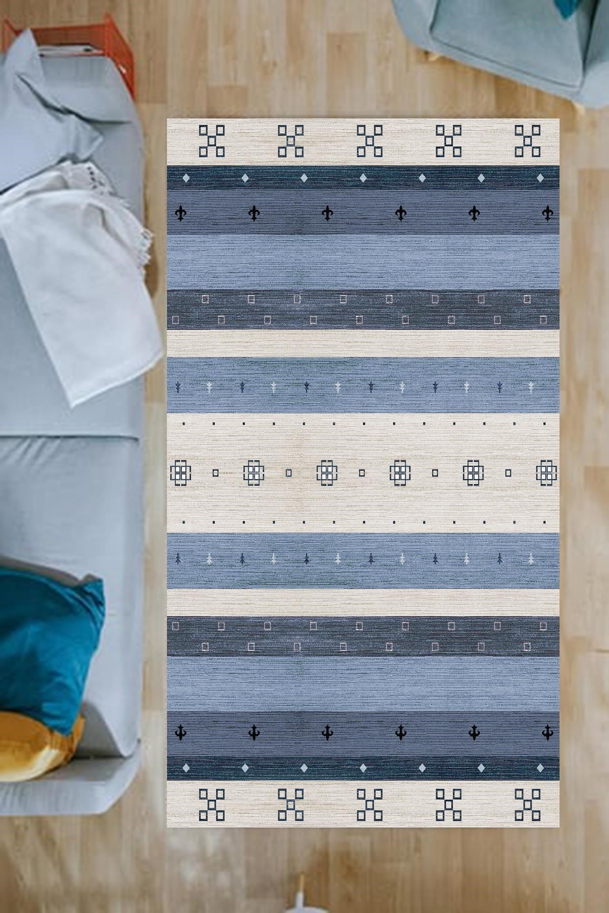 Dijital Baskılı Yıkanabilir Mavi Beyaz Modern Desenli Kaymaz Taban Halı