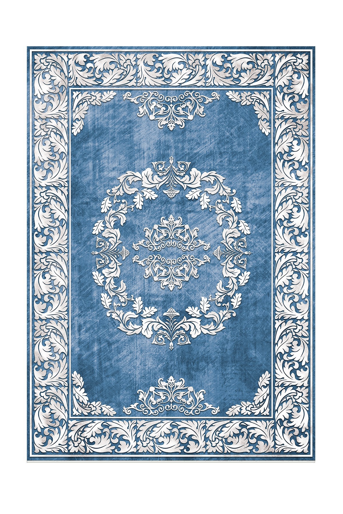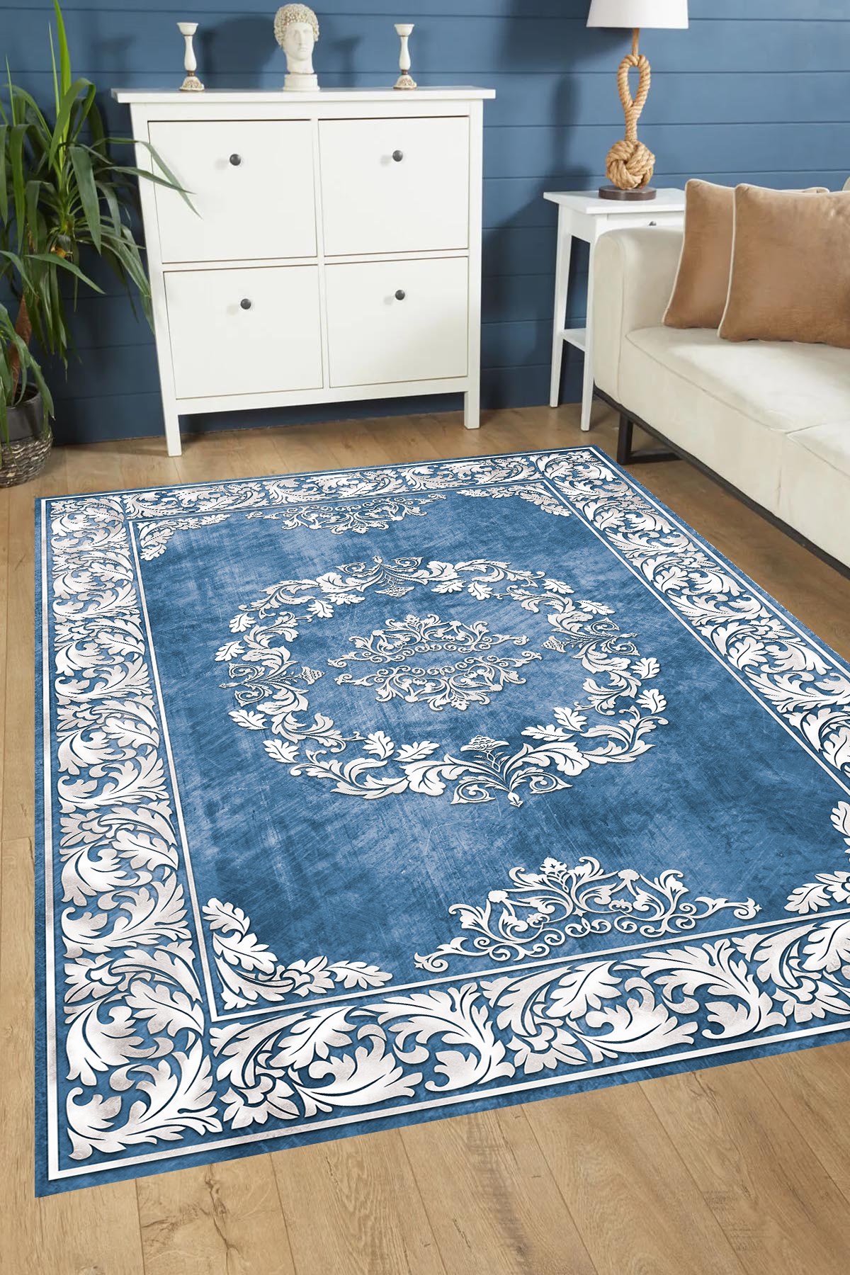 Dijital Baskılı Yıkanabilir Mavi Renkli Beyaz Desenli Kaymaz Taban Halı