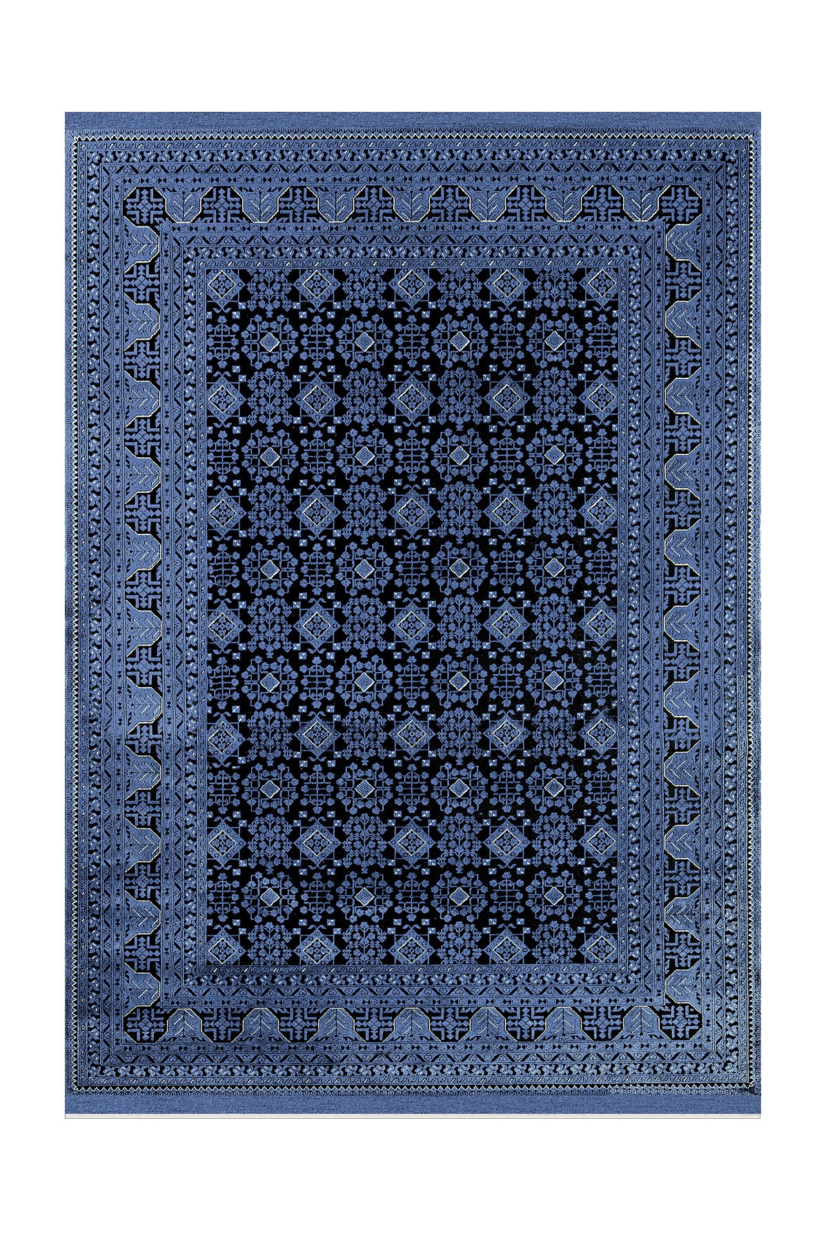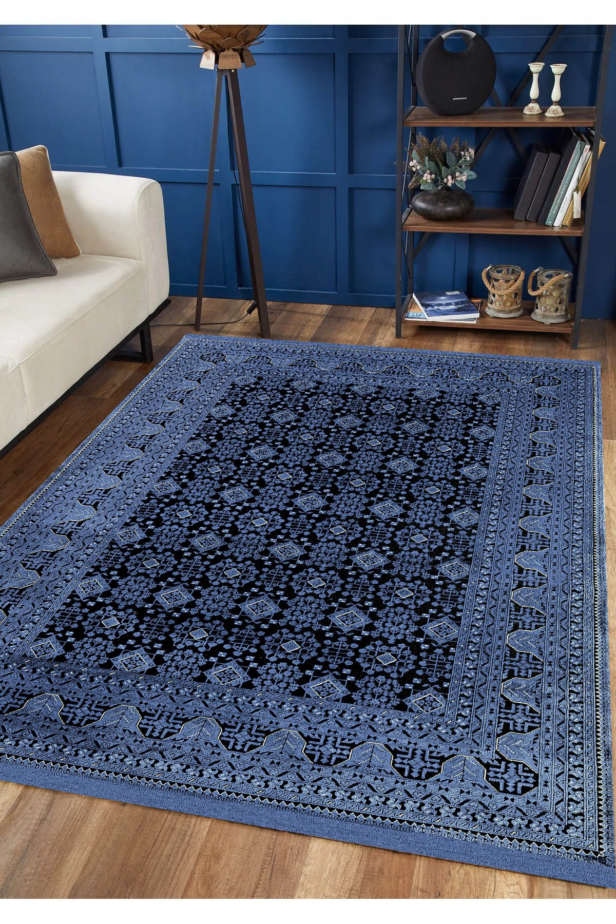 Dijital Baskılı Yıkanabilir Mavi Renkli Siyah Desenli Kaymaz Taban Halı