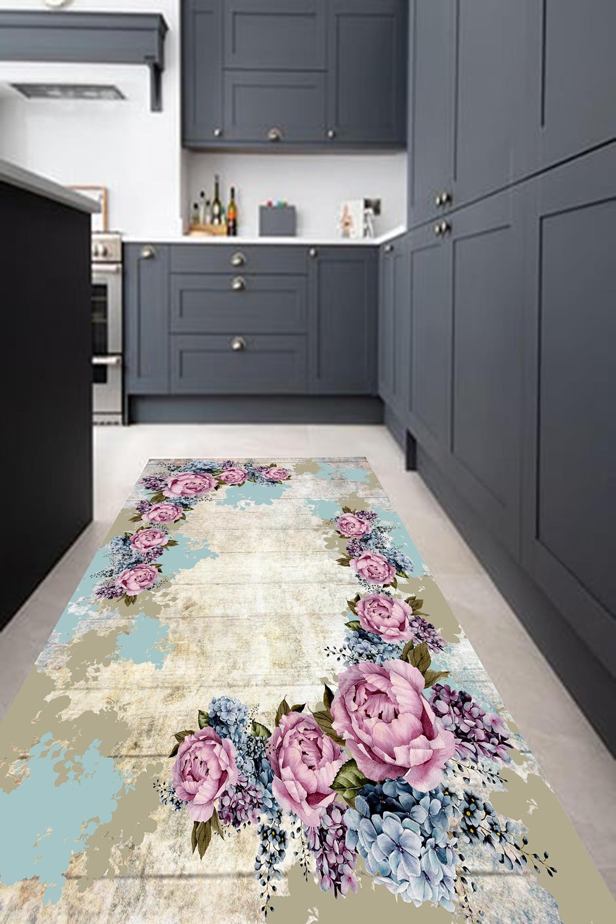 Dijital Baskılı Yıkanabilir Pembe Gül Desenli Kaymaz Taban Mutfak Halısı