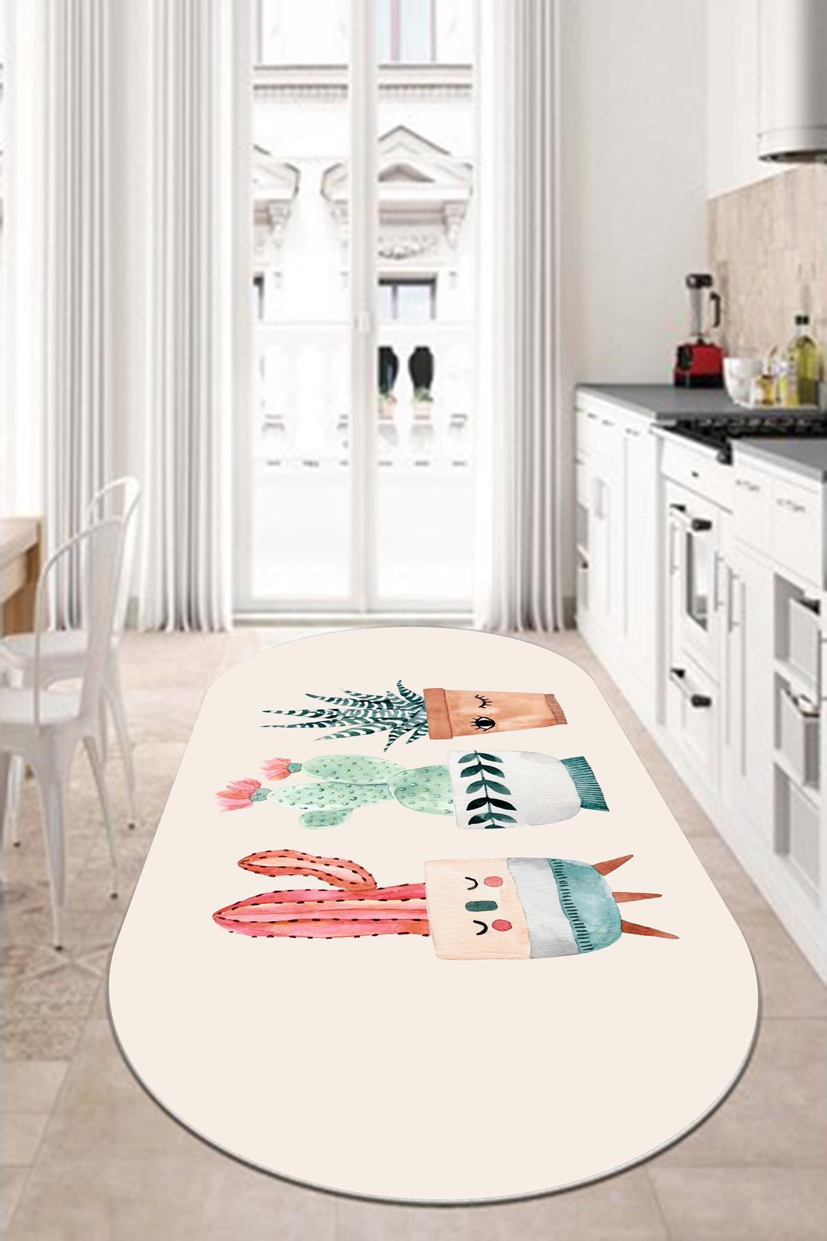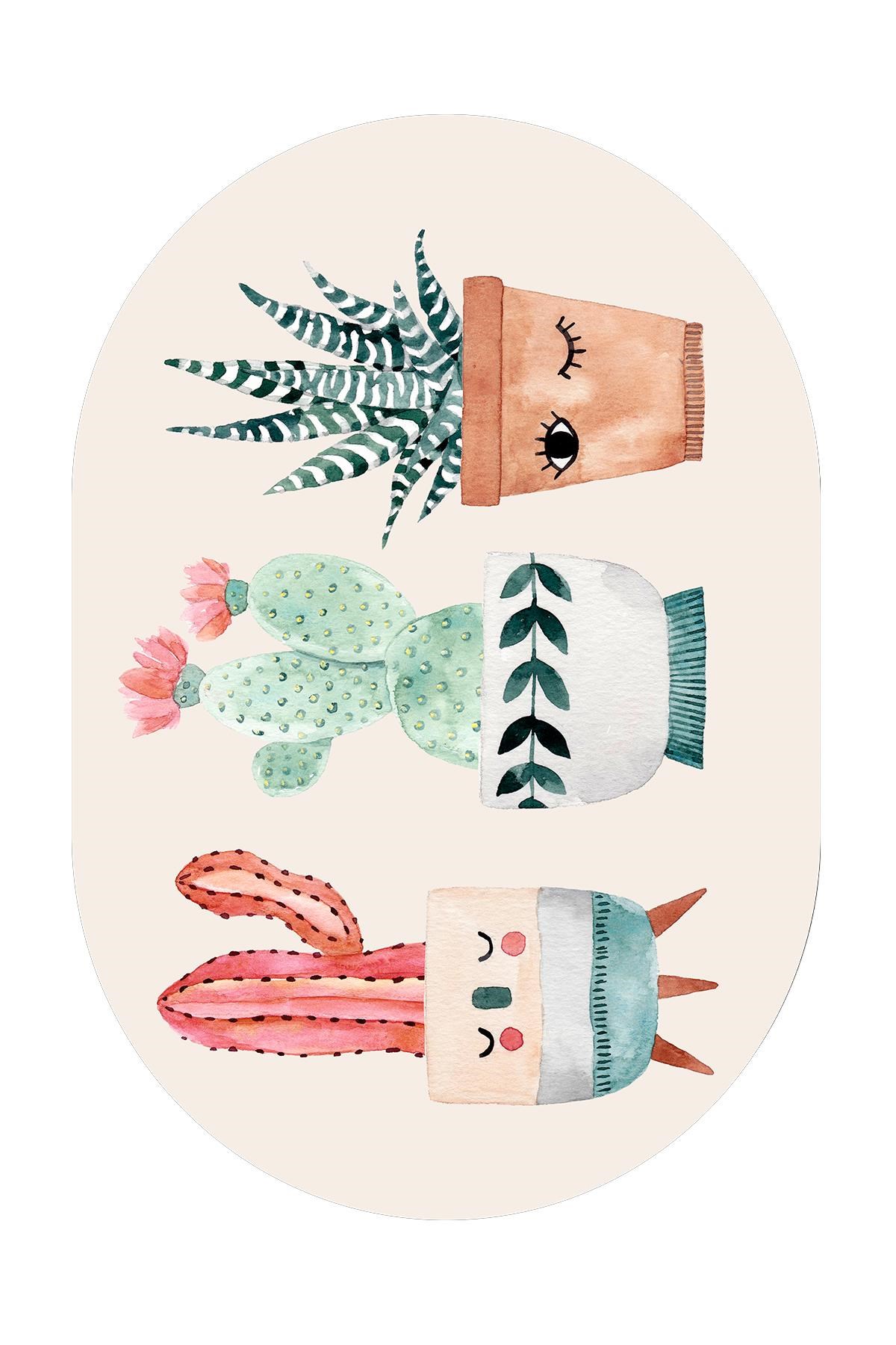 Dijital Baskılı Yıkanabilir Renkli Kaktüs Desenli Oval Kaymaz Taban Halı