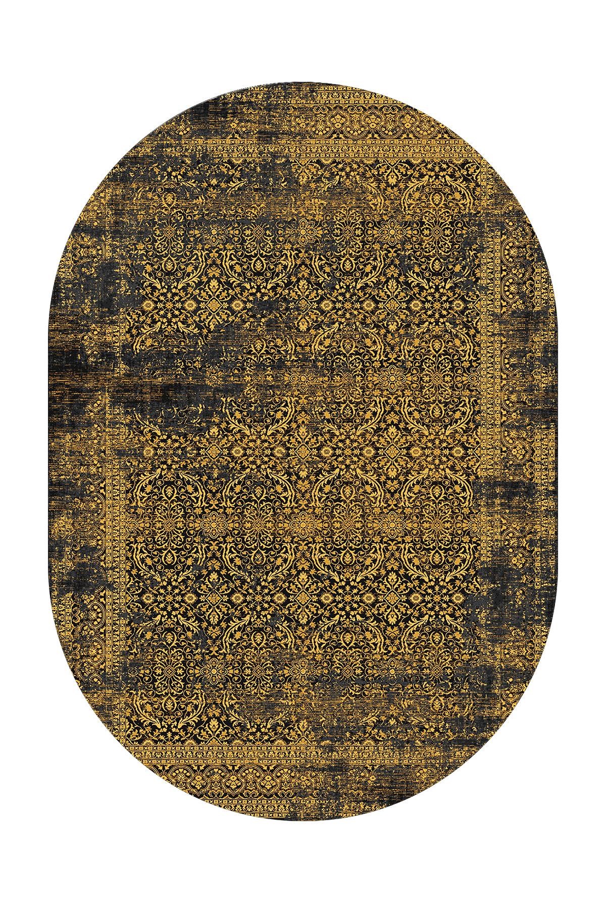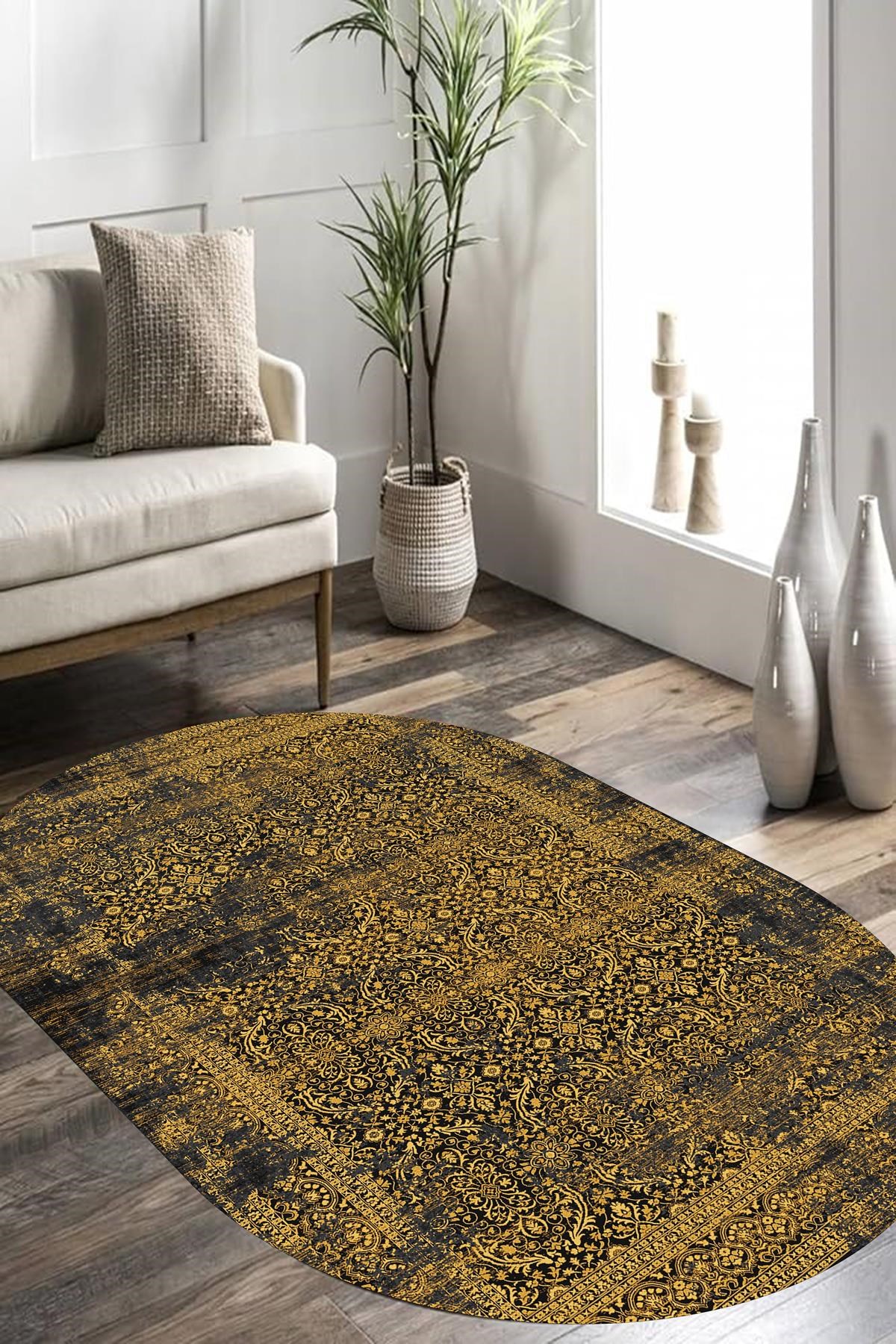 Dijital Baskılı Yıkanabilir Sarı Renkli Desenli Oval Kaymaz Taban Halı