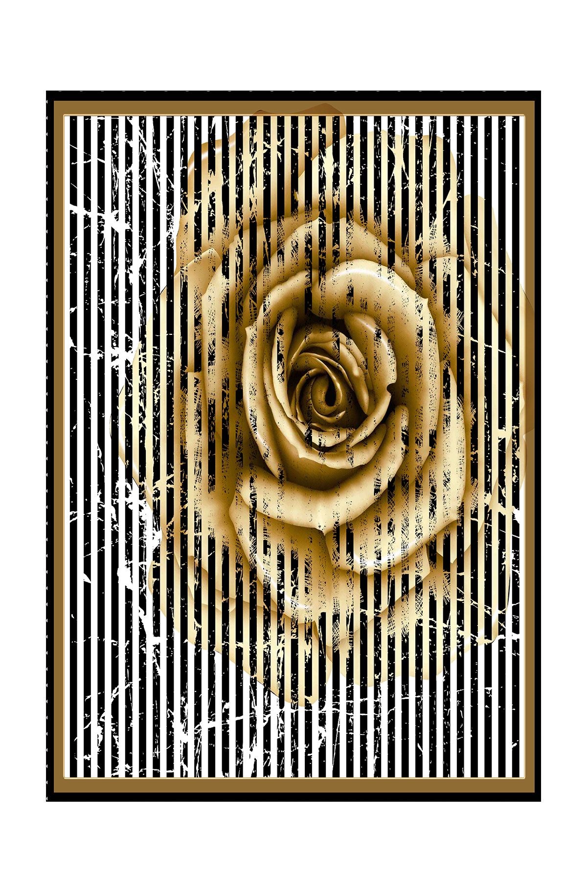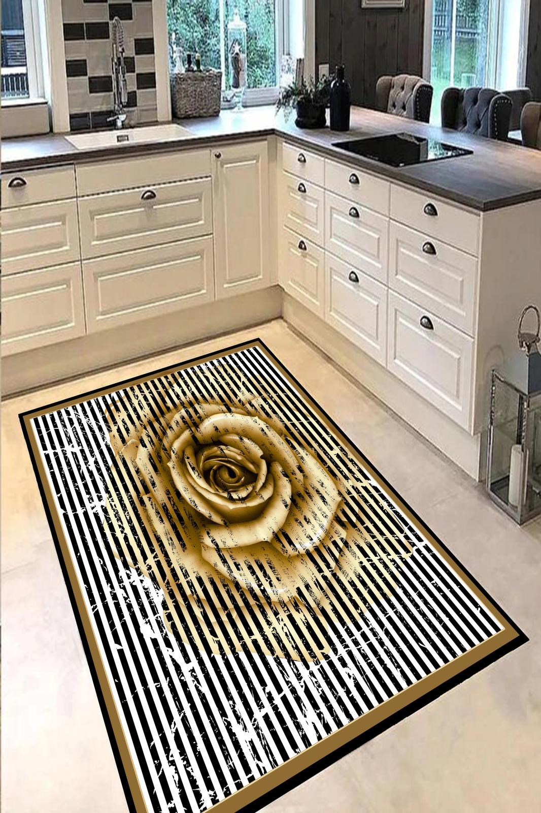 Dijital Baskılı Yıkanabilir Siyah Renkli Gold Gül Desenli Kaymaz Taban Mutfak Halısı