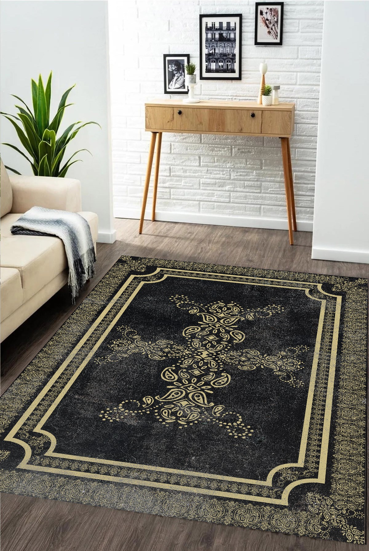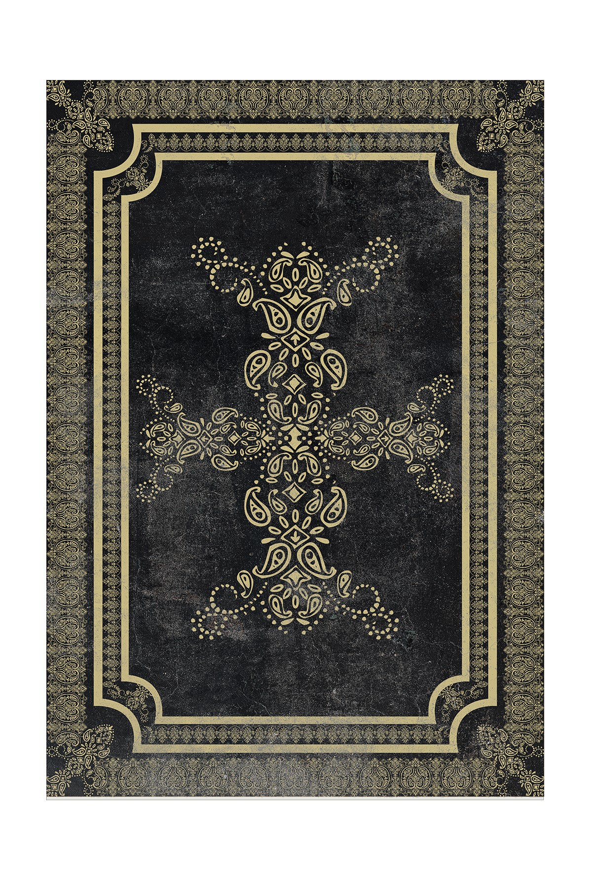 Dijital Baskılı Yıkanabilir Siyah Renkli Gold Klasik Desenli Kaymaz Taban Halı